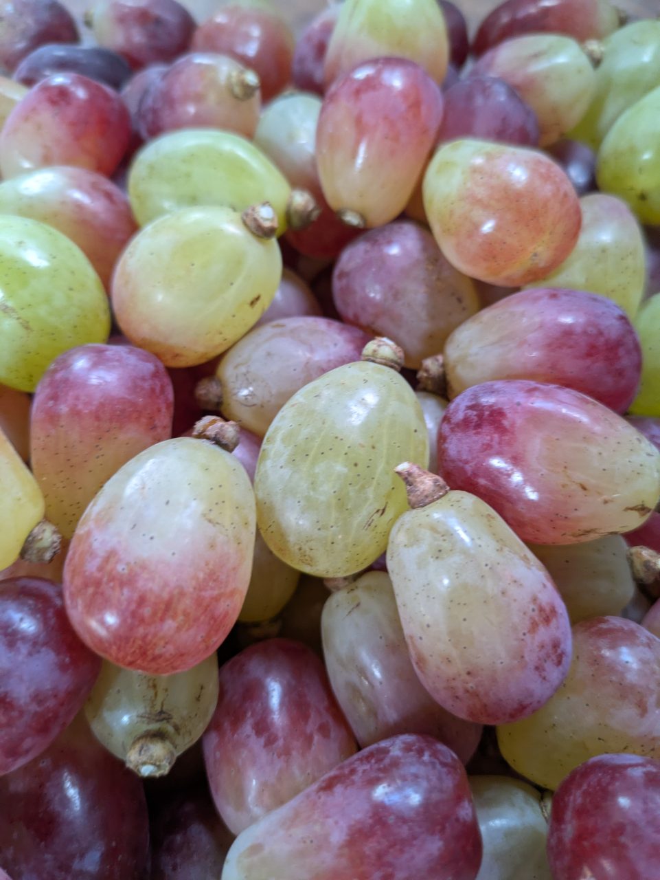 長楕円形の大きな粒で、表面の果粉を拭くと美しい艶が出ます。皮ごと食べられる:
